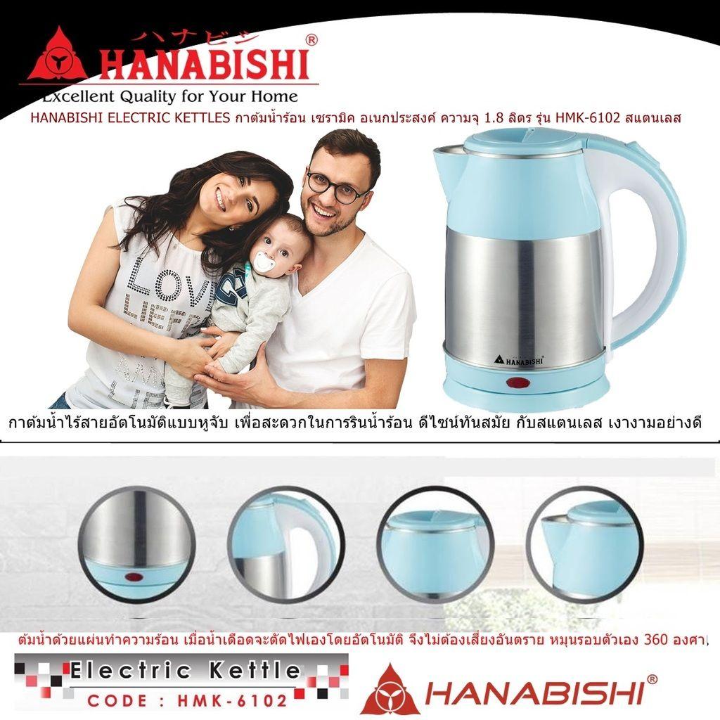 HANABISHI ELECTRIC KETTLES (Blue) กาต้มน้ำร้อน เซรามิคอเนกประสงค์ความจุ 1.8 ลิตร สีฟ้า รุ่น HMK-6102 วัสดุเป็นสแตนเลส อย่างดี กาต้มน้ำไร้สายแบบหูจับ มีรีวิวจากผู้ใช้งานจริง มีเก็บเงินปลายทาง จัดส่งจริง ถึงมือแน่นอน