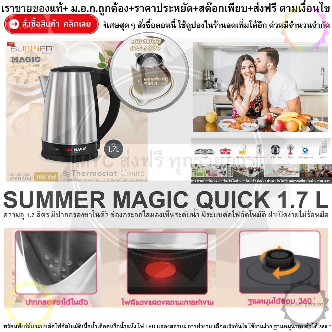 - SUMMER MAGIC QUICK 1.7 L ความจุ 1.7 ลิตร มีปากกรองชาในตัว ช่องกระจกใสมองเห็นระดับน้ำ มีระบบตัดไฟอัตโนมัติ ฝาเปิดง่ายไม่ร้อนมือ